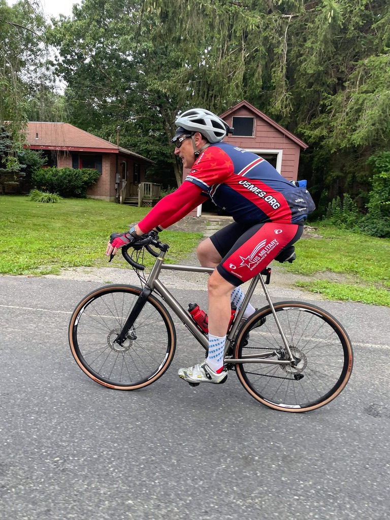 I didn't notice this when I took this picture but even his carbon rims are customized with his Der Dachs logo. All together, that's a hot looking bike. He is all about the fit of the bike and performance and he thought that I my fit to my bike might be a little off so he took a few pictures of my riding alongside of him.
